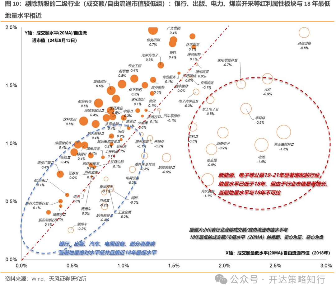 二级行业看,银行、出版、电力、煤炭开采、工业金属等具备一定红利属性的板块和食饮、汽车等消费类板块当前成交额/自由流通市值的水平和18年最低点类似,且绝对水平横向比较也偏低,从量能水平看可能是率先“到位”的方向。