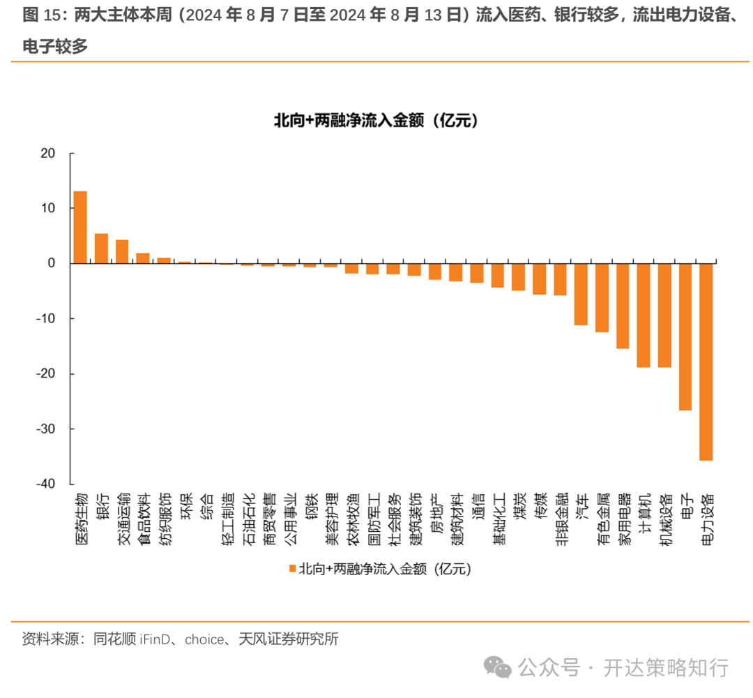 本周(2024年8月7日至2024年8月13日)北向资金流出,主要流入行业为医药生物、银行、公用事业、交通运输、纺织服饰;北向本周净流向-116.01亿元。杠杆资金流出;杠杆资金流入行业前五为食品饮料、通信、交通运输、轻工制造、商贸零售,后五为公用事业、传媒、机械设备、电子、计算机。以两大资金主体合力结果来看,医药生物、银行、交通运输、食品饮料、纺织服饰获得较强共识,而家用电器、计算机、机械设备、电子、电力设备则面临两大资金主体共同流出压力。