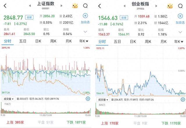 至收盘,上证综指跌0.27%,报2848.77点;科创50指数跌0.88%,报685.53点;深证成指跌0.82%,报8162.18点;创业板指跌0.76%,报1546.63点。