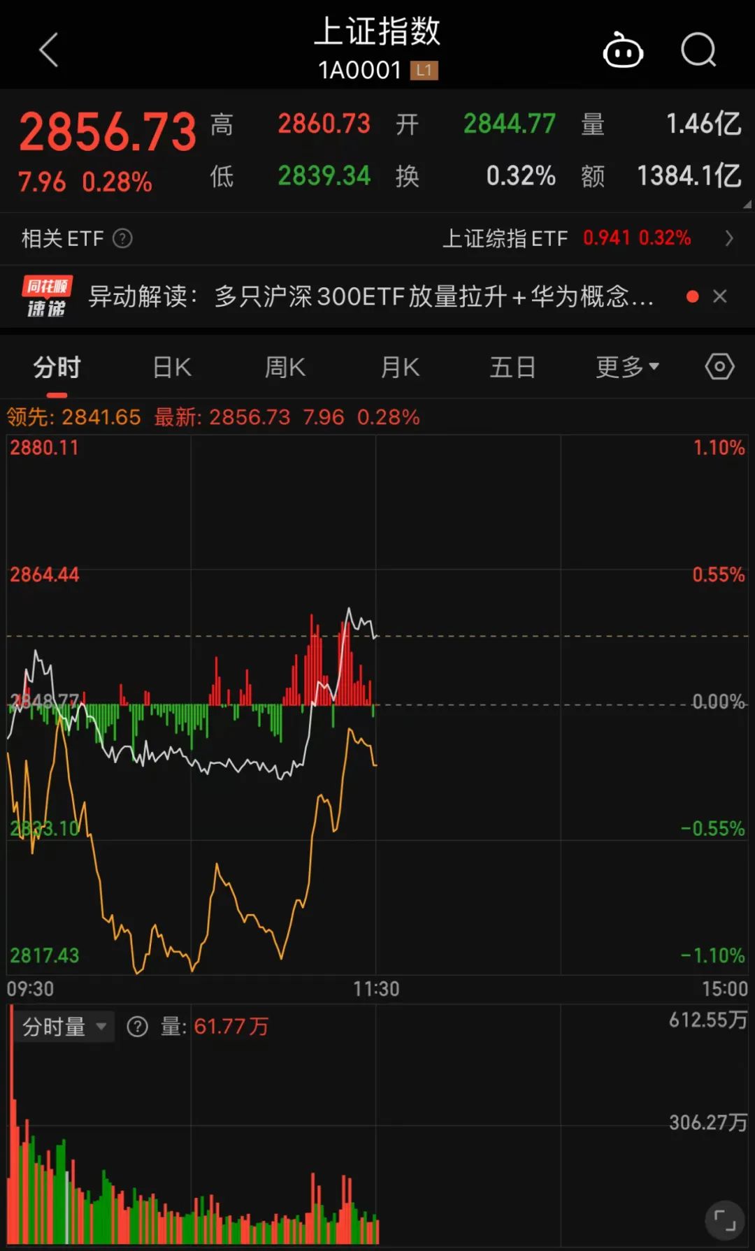 11:15-11:20时间段,权重股显著飙涨:中国平安、美的集团、宁德时代、兴业银行、中信证券等权重股直线拉升,保险、券商等大金融板块发力。A股三大股指扩大涨幅。