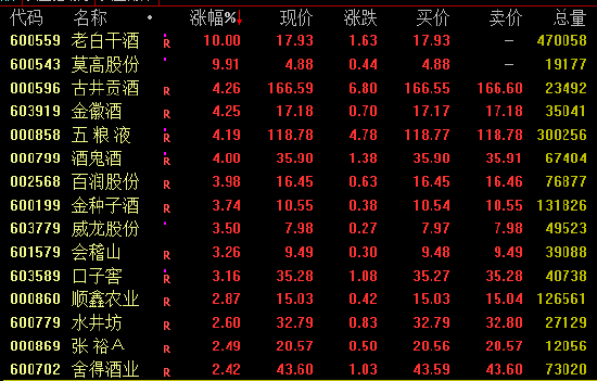 酒类股今日反弹走高,截至收盘,老白干酒、莫高股份涨停,古井贡酒、金徽酒、五粮液涨超4%,贵州茅台涨近2%重返1400元上方。