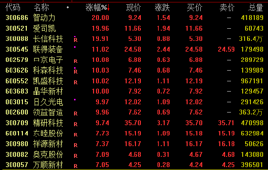 折叠屏概念盘中强势拉升,截至收盘,智动力、爱司凯、长信科技“20cm”涨停,联得装备涨超10%,中京电子、科森科技、凯盛科技、领益智造等亦涨停。