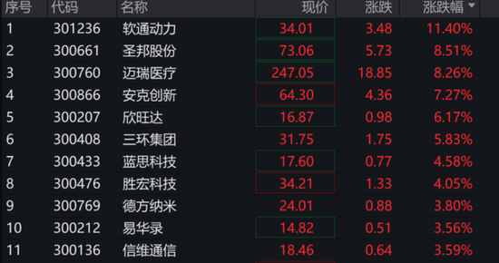 创业板指涨2%,软通动力涨逾10%,迈瑞医疗涨超8%,宁德时代涨逾2%