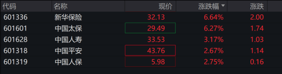 保险板块大幅走强,中国太保、新华保险涨超6%,中国人寿、中国人保、中国平安均涨逾2%。部分银行股拉升,中国银行低开后迅速走高,一度涨1%。招商银行涨0.5%。
