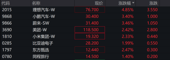恒生科技指数盘中涨2%,理想汽车、小鹏汽车涨超6%。