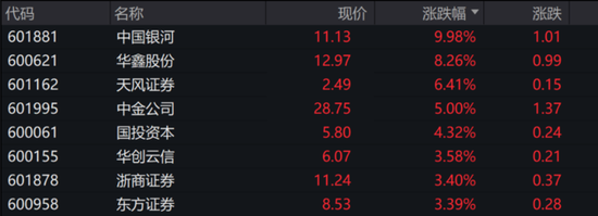 券商等大金融股持续走强,中国银河涨超8%,华鑫股份涨超5%,东方证券、中金公司、国泰君安、中信建投、浙商证券等跟涨。