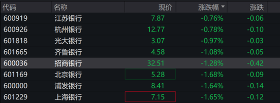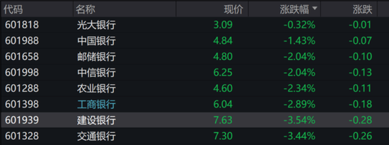 建设银行、交通银行跌超3%,招商银行跌0.3%,此前一度涨超0.5%。