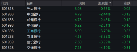 国有五大行集体大跌,工商银行、建设银行、农业银行、交通银行跌超4%,中国银行跌超2%。招商银行跌1.2%。