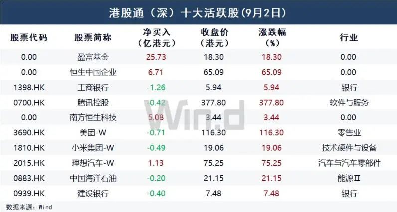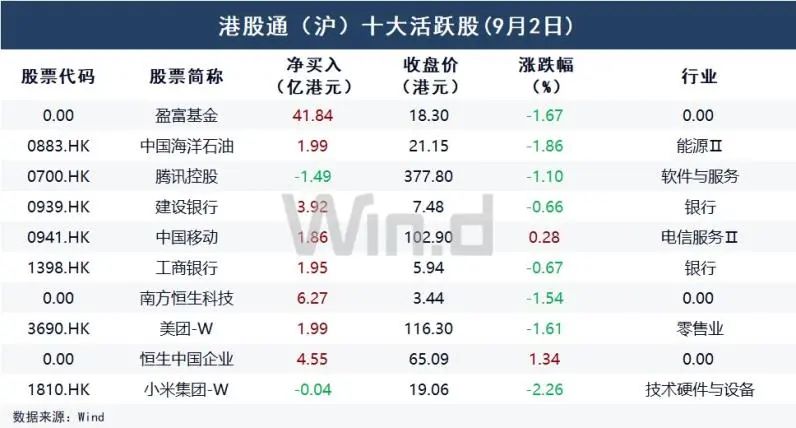 9月2日,南向资金大举买入。据Wind资讯,南向资金净买入额达119.39亿港元。盈富基金、南方恒生科技、恒生中国企业分别获净买入67.56亿港元、11.35亿港元、11.26亿港元;腾讯控股净卖出额居首,金额为1.91亿港元。