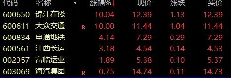热点方面,公共交通概念在无人驾驶浪潮的推动下继续大涨,板块指数跳空高开高走,盘中一度飙升近8%。大众交通开盘一字涨停,创2015年11月以来近9年新高(复权),锦江在线亦开盘后秒速涨停,申通地铁江西长运等涨幅居前。