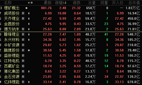 受碳酸锂价格大涨影响,锂矿板块早盘逆市大幅拉升,“锂王”天齐锂业早盘涨停,金圆股份也涨停,德方纳米、赣锋锂业涨超7%。天齐锂业涨停较为罕见,上次涨停还是在去年5月,今年从未有过一次涨停。