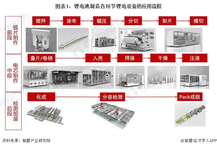 锂电池制造设备(简称“锂电设备”)是指利用设备将电化学物料通过各种工序而制成电芯及参与电池系统组装的各类设备的总称。各类锂离子电池的制造可统一分为前段极片制作、中段电芯制作、后段检测组装三个个工序段。具体各环节锂电设备的应用流程如下: