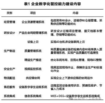 技术创新模式。从智慧研发、智能生产、供应链协同、智慧服务的生产全流程,旨在打造精益化、透明化的数字化工厂,协助企业实现透明科学的产品全生命周期管理。数字化管控能力建设的主要内容(如表1)。