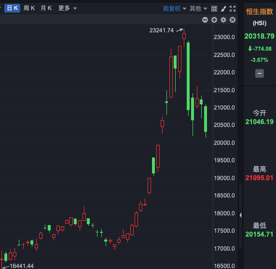 恒生指数收盘跌3.67%,恒生科技指数跌4.65%。汽车股、科技股跌幅居前。蔚来跌约8%,哔哩哔哩跌约8%,美团跌约7%,小鹏汽车跌约7%。地产股下跌,旭辉控股集团跌约13%。