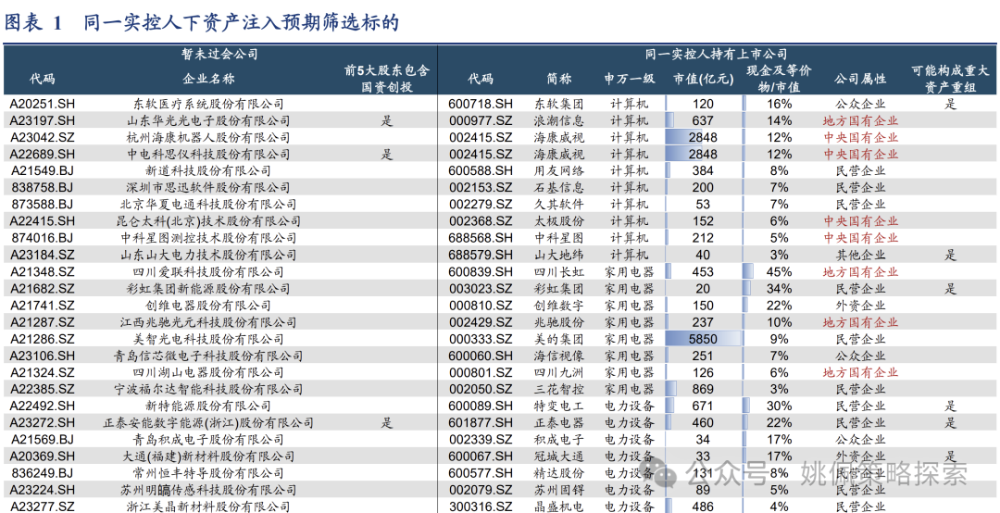 最终筛选出71家存在同一实控人下资产注入预期的上市公司。按照申万一级行业分类,主要集中于计算机、家电、电新、电子等行业;其中34家为央国企;根据《上市公司重大资产重组管理办法》中构成重大资产重组的标准,若实行资产注入有可能构成重大资产重组的有20家;筛选出的暂未过会公司名单中,前5大股东包含国资创投的有16家。