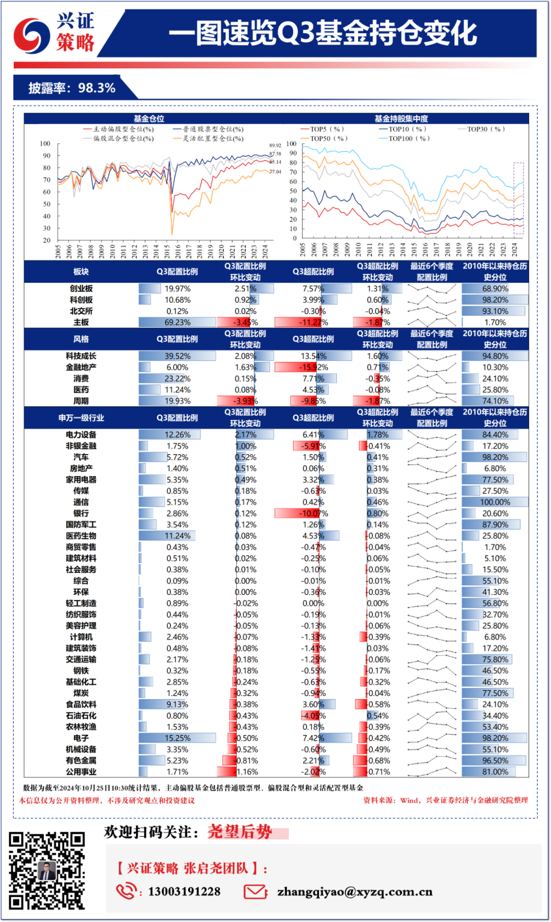 截至2024年10月25日10:30,主动偏股基金三季报披露率98.3%,兴证策略团队全方位拆解主动偏股基金持仓特征以及调仓趋势,供投资者参考。详细数据库欢迎联系兴证策略团队或对口销售获取。