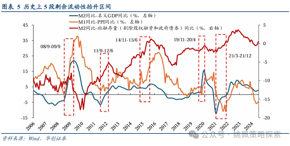 未来3-6个月:货币率先发力,财政跟进到经济基本面改善仍需时间,剩余流动性大概率低位逆转上行。剩余流动性可能是当下影响市场最重要的宏观因素之一,我们对剩余流动性的判断基于政策对货币供应量和实体经济需求两端考虑,货币宽松短期内抬升货币供应,而财政跟进和基本面改善存在时滞,由此带来短期3-6个月内剩余流动性的充裕。从货币供应量来看,货币政策影响最为直接,央行可以通过降准降息等宽松动作扩大货币供应量?,当前货币政策已率先发力,9/24降准50bp,10/21降息25bp,我们认为未来半年内有望看到货币宽松的持续发力,降息幅度或在50-100bp,由此带来M2的快速回升,9月M2同比6.8%,根据Wind一致预期25Q1或将提升至9.2%。历史上看货币宽松通常可以在较短时间内带动货币供给抬升,典型如02/2央行降息0.5个百分点,M2同比迅速抬升,从02/2的13%快速上行至03/8的21.6%;08/9央行开启降息,并在年末连续降息四次,M2同比从08/11触底14.8%后快速抬升至09/11的29.7%。实体经济需求来看,从央行货币宽松带动货币供给增加到实体需求改善存在2-3个季度时滞,一方面,财政政策审批流程多,落地推进相比货币政策更慢,另一方面,从政策发力→基本面改善需要时间,因此实体经济需求通常滞后于货币供应增加,典型如08/9-08/11央行连续4次降息,08/11出台四万亿刺激方案。货币供应量短期反应快速抬升,M2同比从08/11触底反弹,而实体经济需求中,PPI从09/7才触底反弹,名义GDP同比从09Q3才转为回升。未来6个月货币先行和基本面的时滞或将带来短期剩余流动性的扩张,我们以Wind一致预期作为中性假设,25Q1 M2同比提升至9.2%,24/12社融同比8.1%,25/12为8.2%,我们假设25Q1社融同比8.1%,剔除股权融资和政府债券后同比7.1%,对应剩余流动性从当前0.5%提升至2.1%,乐观假设下M2上行幅度更高而实体经济恢复更缓,对应剩余流动性可能进一步提升至4.7%。类似的短期快速流动性扩张,可类比历史上14/11-15/6,货币宽松而基本面改善滞后,剩余流动性从-3%提升至0.5%。