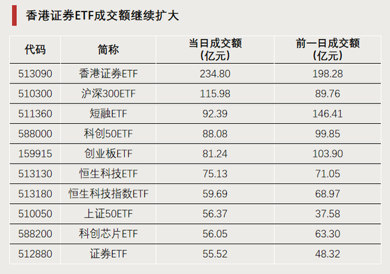 11月7日,沪深两市成交额连续第三个交易日突破2万亿元,合计达2.56万亿元。ETF方面,香港证券ETF(513090)成交额继续扩大,达234.8亿元,沪深300ETF(510300)成功突破100亿元。此外,“双创”主题ETF虽然同样交投活跃,但较前一交易日相比均有所缩量。