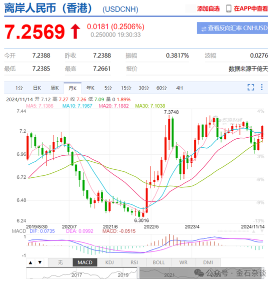 美元指数飙升之下,其他币种纷纷走跌,日元一路狂跌,从139关口一路跌至156关口,10月以来跌幅近9%;美元兑欧元,美元兑人民币全部是大幅上涨状态,离岸人民币从川普大选前一日的7.1关口跌至目前7.25关口。