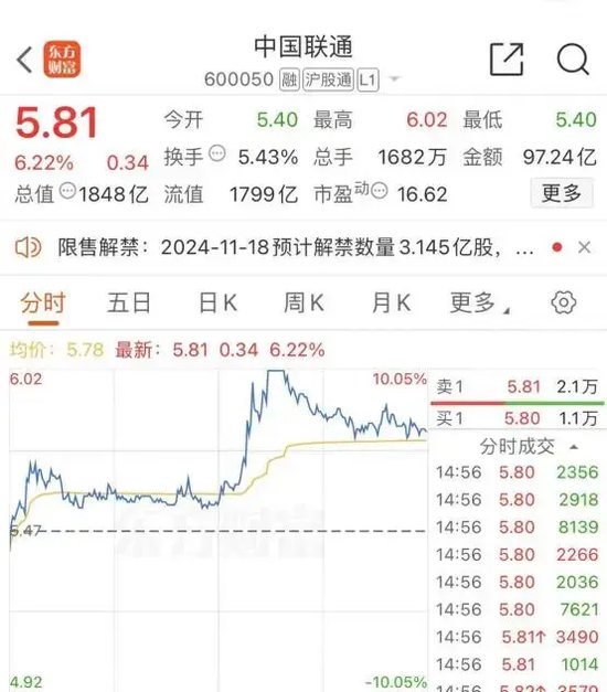 11月15日,三大运营商午后拉升,中国联通盘中一度涨停。截至收盘,中国联通涨超6%,中国电信涨超2%,中国移动涨超1%。