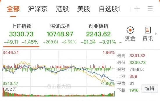 15日,A股三大股指午后震荡下挫。上证指数收盘报3330.73点,跌1.45%。深证成指、创业板指分别收跌2.62%和3.91%。