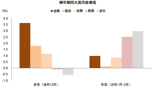 风格层面,成长价值风格对比来看,跨年阶段价值整体跑赢成长,但期间易出现风格转换,岁末大类风格呈现为金融>消费>周期>成长,历史数据显示年初成长风格表现偏占优,大类风格呈现为成长>周期>金融>消费。风格转换原因可能为年底重要会议期间政策预期较强,关联性较高领域易有相对表现,伴随风险偏好提升,成长风格逐步活跃。