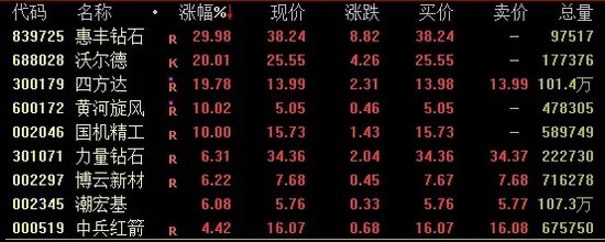 培育钻石概念盘中再度走强,截至收盘,惠丰钻石、沃尔德涨停,四方达逼近涨停,黄河旋风斩获3连板,力量钻石涨超6%。