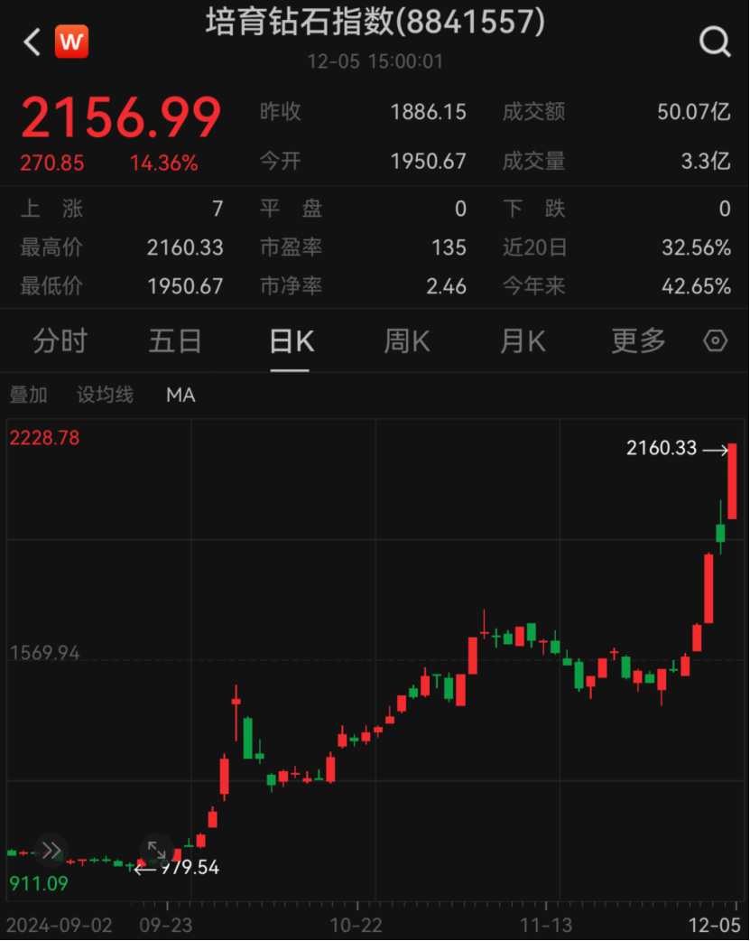 今日,Wind培育钻石概念指数(8841557)突然大涨,截至收盘,涨幅达14.36%,创下今年以来新高。从日线来看,该指数连续走强,本周累计涨幅已超37%。