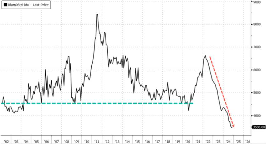 反映钻石市场整体表现的钻石标准指数(Diamond Standard Index)现已跌至自2022年初以来的最低水平。
