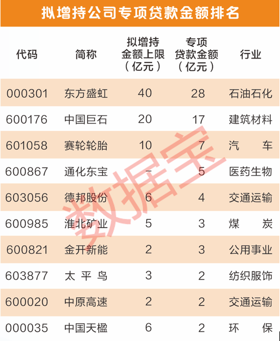 数据宝对拟增持金额上限在1亿元以上的48家上市公司进行统计,22家上市公司已取得银行出具的《贷款承诺函》,主要以地方国企为主,包括淮北矿业、金开新能、中原高速、亚盛集团等。