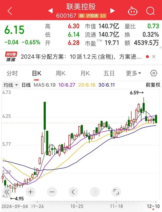 联美控股9月以来累计上涨15.6%,最新收盘价6.15元/股,滚动市盈率为19.71倍。
