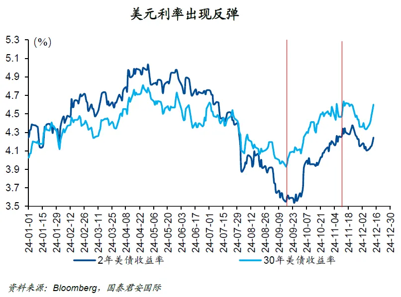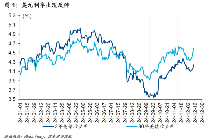 下面这张图,我们可以看到美债利率在9月和11月两次议息会议后的反应,我们会发现,9月降息50个基点后,美债利率出现了大幅反弹,这让市场感叹美联储降了一次假息,但11月份降息后,美债利率则出现了正常的下探,但在近期,长端利率基本上收复了11月降息以来的降幅。从利率的反应来看,市场在price in两件事情,第一是明年可能的“暂停”,目前的市场预期是美联储会在明年1月暂停降息,但明年仍然会有大约3次左右的降息;第二是市场在price in美国经济的“软着陆”,这体现为短端利率上行幅度较小,即期限利差开始出现一定的走扩。由于特朗普当选后大概率会实施较为宽松的财政政策,因此市场对于经济有一定的憧憬、并对通胀有一些担忧,都是正常的反馈。
