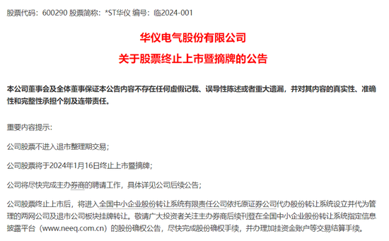 *ST华仪成为2024年第一只退市股。昨日晚间,*ST华仪发布公告称,收到上交所终止其股票上市的决定。公司股票因连续20个交易日收盘价均低于1元,已触及交易类退市指标,成为2024年第一只退市的股票。上交所于1月9日作出公司股票终止上市的决定,公司股票将于1月16日终止上市暨摘牌。