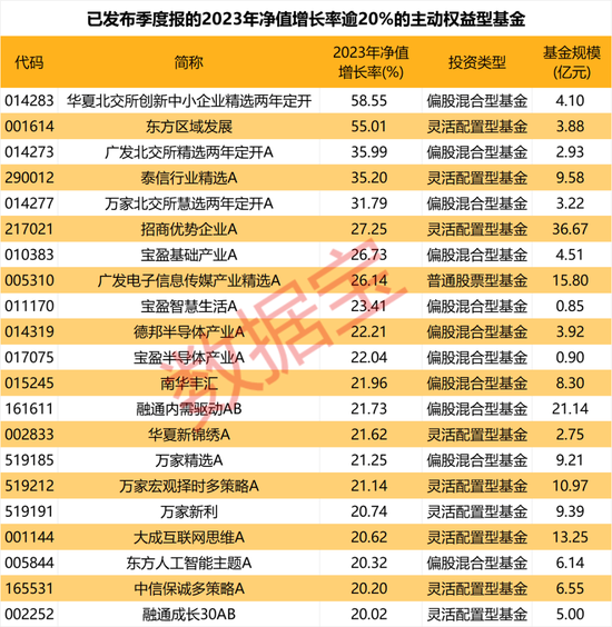 截至目前,2023年净值增长率在20%以上的主动权益基金中,有21只已发布四季报(只统计A类)。华夏北交所创新中小企业精选两年定开、东方区域发展获得2023年主动权益基金的冠亚军,均已发布四季报。