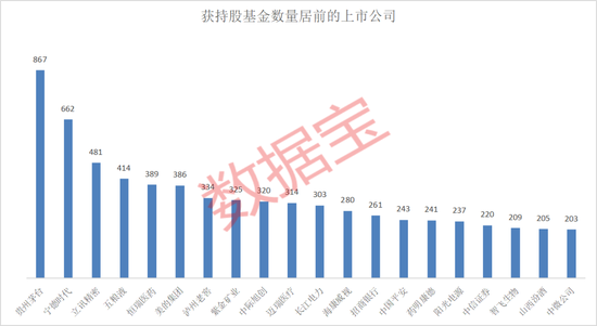 以持股基金数统计,目前有20家上市公司获得200只以上基金共同持有。贵州茅台、宁德时代、立讯精密和五粮液暂列四强,持股基金数分别为867只、662只、481只、414只。从行业分布看,上述20股中,食品饮料、医药生物各有4股,电力设备、电子、非银金融各有2股。