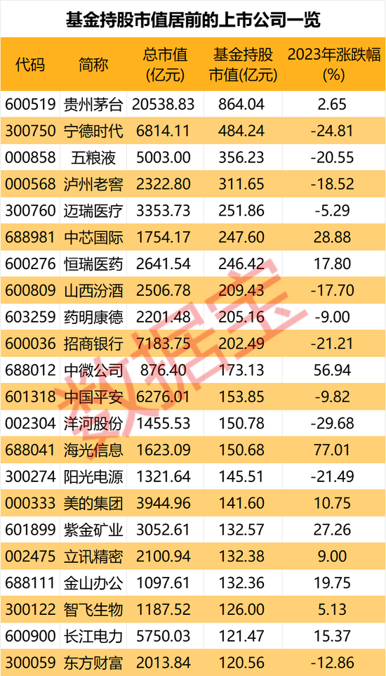 以持股市值计算,共计27股获基金持股市值在百亿元以上,贵州茅台、宁德时代、五粮液和泸州老窖暂列前四,持股市值依次为864.04亿元、484.24亿元、356.23亿元、311.65亿元。