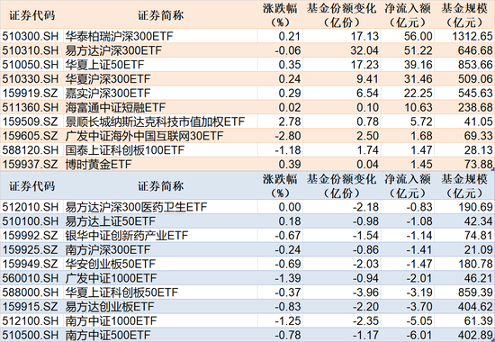 Wind数据显示,在1月19日的非货币ETF市场中,华泰柏瑞沪深300ETF基金份额增加了17.13亿份,净流入额高达56.00亿元,基金规模达到1312.65亿元。易方达沪深300ETF基金份额增加了32.04亿份,净流入额为51.22亿元,基金规模为646.68亿元。华夏上证50ETF基金份额增加了17.23亿份,净流入额为39.16亿元,基金规模为853.66亿元。