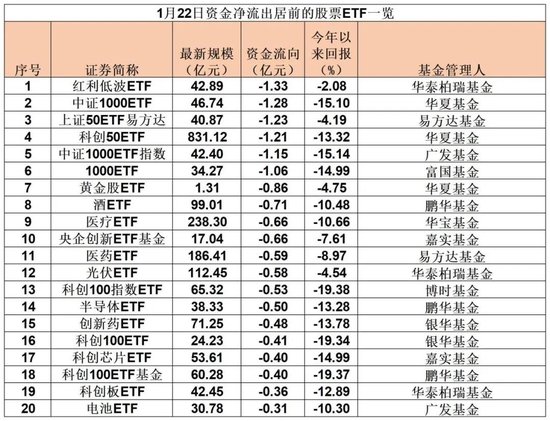 从资金净流出排行看,红利低波、黄金股、酒、医疗、创新药、光伏、半导体、电池等一些热门主题型、赛道型ETF产品成为昨日“失血”主力,其中,华泰柏瑞红利低波ETF基金,单日资金净流出1.33亿元。此外,华夏、广发、富国旗下中证1000ETF、华夏科创50ETF产品资金净流出位居前列,单日“失血”均超1亿元。