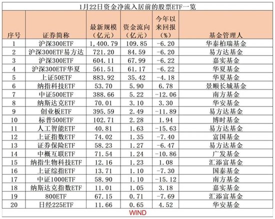 记者了解到,市场震荡之下,大型基金公司旗(金麒麟分析师)下ETF持续资金净流入。1月22日,易方达旗下ETF合计资金净流入89亿元。其中,易方达沪深300ETF一口气净流入84.6亿元,让该ETF场内规模增至721亿元,加场外规模总计734亿元。易方达创业板ETF、易方达中证人工智能ETF、易方达沪深300非银ETF净流入2.5亿元、1.6亿元、1.3亿元。