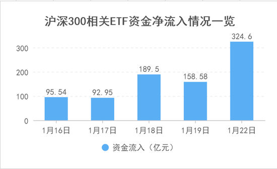 记者注意到,随着大盘波动加剧,以沪深300为首的宽基ETF再现“大跌大买”趋势。银河证券基金研究中心统计数据显示,近5个交易日,沪深300相关ETF产品单日资金净流入分别为95.54亿元、92.95亿元、189.50亿元、158.58亿元、324.60亿元,合计高达860.97亿元,资金抄底意图明显。