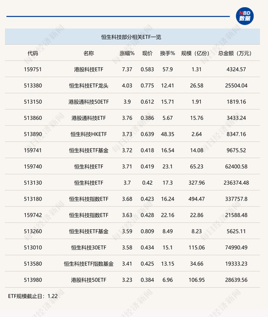 点评:恒生科技ETF龙头(513380)半日涨幅也达到4.03%,其规模为26.58亿份,半日成交金额为2.55亿元,该ETF追踪的是恒生科技指数,目前追踪该指数的ETF一共有10只,其中,恒生科技指数ETF(513180)和恒生科技ETF(513130)规模较大,分别达到494.47亿份和327.96亿份,此两只ETF半日成交总额合计高达57.41亿元。