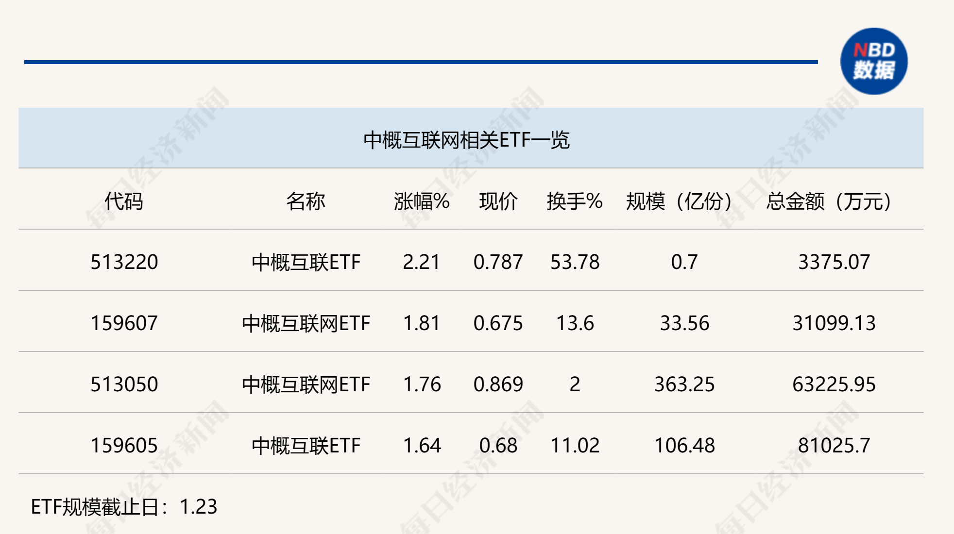 点评:中概互联网ETF(513050)半日涨幅也有1.76%,该ETF规模高达363.25亿份,流动性强,今日上午成交金额为6.32亿元,其追踪的是中证海外中国互联网50指数。