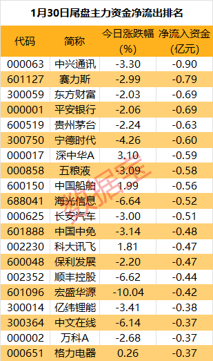 数据宝统计,中兴通讯尾盘主力资金净流出0.9亿元,居首位;其后赛力斯和东方财富尾盘净流出分别为0.79亿元和0.69亿元。