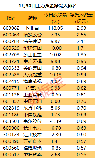 净流入金额居前的还有哈投股份和浦东建设等,分别为2.55亿元和2.11亿元。