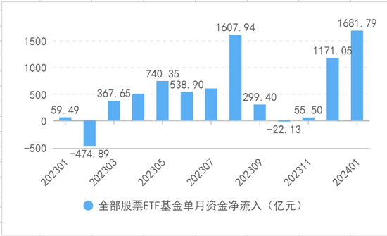 2024年首月,市场波动加剧,资金借道股票ETF加速“抄底”,单月合计资金净流入超1600亿元,创下自去年8月份以来单月资金净流入新高。