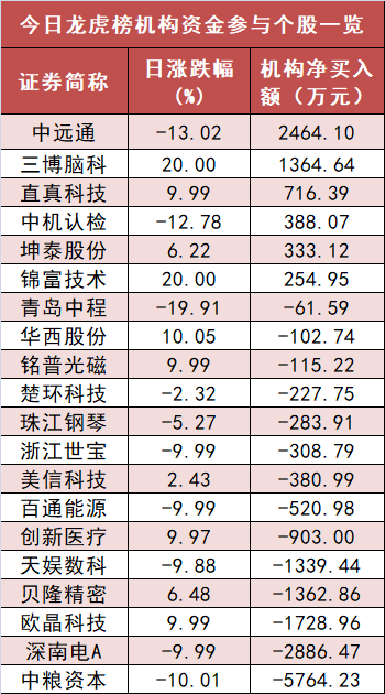 盘后龙虎榜数据显示,机构现身20股,其中中远通等6股现机构资金净买入,中粮资本等14股呈现机构资金净卖出。