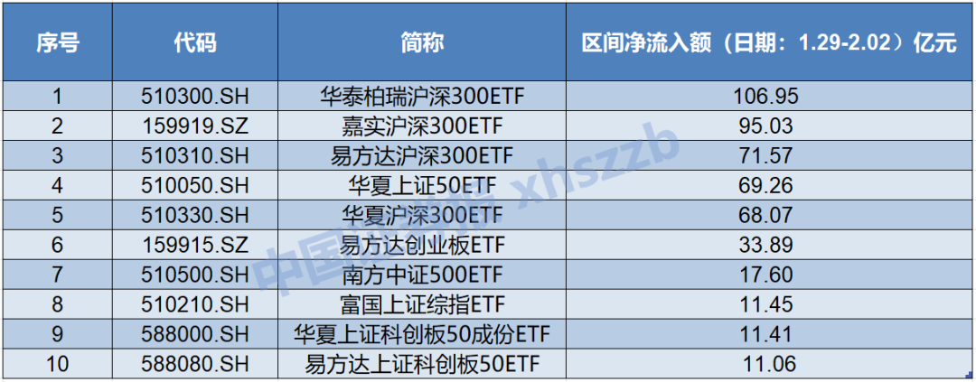 Wind数据显示,截至2月2日,股票型ETF上周五个交易日的区间净流入额达到582.51亿元。其中,多只沪深300指数ETF区间净流入额靠前,如华泰柏瑞沪深300ETF、易方达沪深300ETF。此外,华夏上证50ETF、易方达创业板ETF、南方中证500ETF等区间净流入额也名列前茅。
