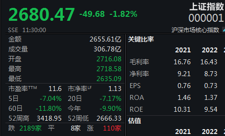 本周一,A股低开低走,沪指失守2700点盘中跌超3%,深证成指、创业板指一度跌逾4%,三大指数均刷新阶段新低。截至上午收盘,上证指数午盘跌1.82%报2680.47点,深证成指跌2.28%报7872.08点,创业板指跌1.7%报1524.07点,科创50指数跌3.37%报650.71点。市场成交额5564.9亿元,北向资金实际净卖出7.29亿元。