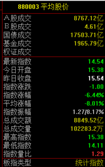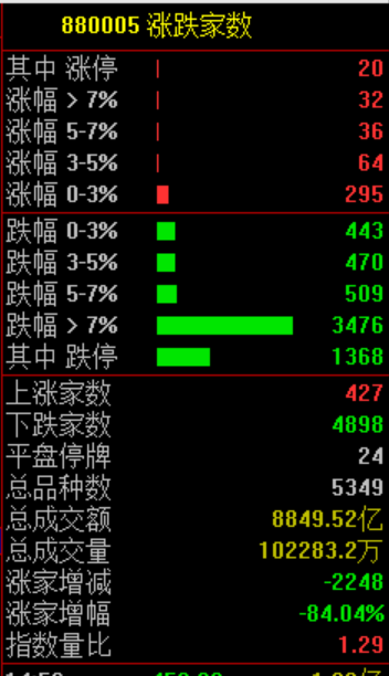 市场共427只个股上涨,4898只个股下跌,1368只个股跌停。