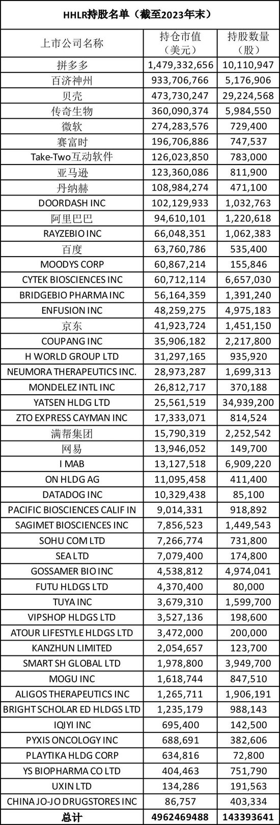 数据显示,截至2023年底,HHLR共计持有49家美股上市公司,持股市值合计为49.62亿美元,环比去年三季度末增长10.7%。从持仓来看,HHLR依旧偏爱中概股,并对多只科技和生物医药股票进行了增持,去年末其前十大重仓股还出现了“新面孔”。